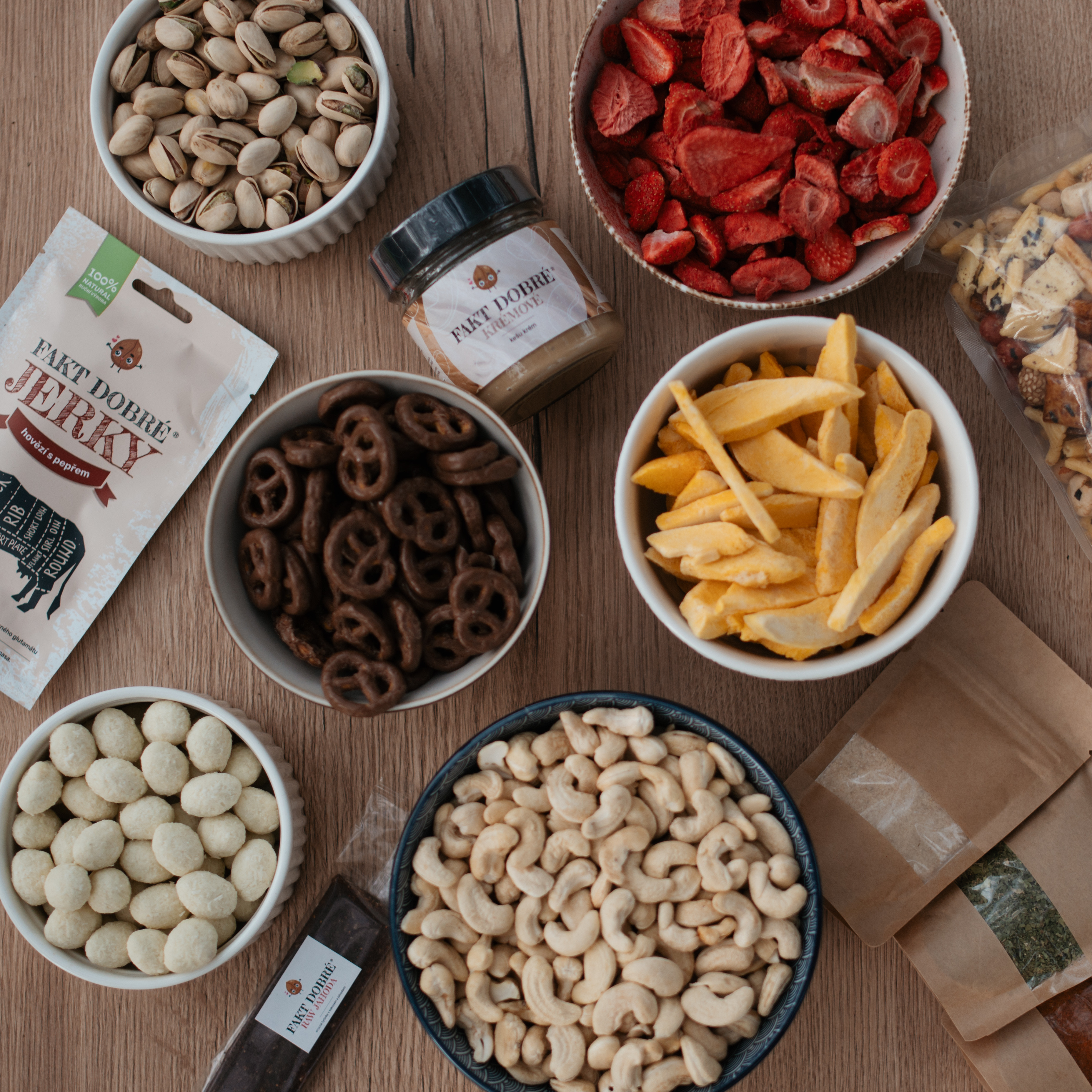 Jak šel čas, postupně jsme začali rozšiřovat nabízený sortiment, a tak jsme do naší řady FAKT DOBRÉ přidali poklady z ovocného ráje – sušené a lyofilizované ovoce. Je libo mango, jahody, prémiové datle nebo jiné ovocné lahůdky? V tom případě jste tu správně! To ale není ani zdaleka vše. Naše touha poskytnout vám mnohem více nás vedla k tomu, zařadit do naší nabídky i výběrovou kávu, rozmanitá semínka a koření, krekry, tyčinky, oříškové krémy, kaše a jerky. A sportovci? I ti si u nás přijdou na své díky široké nabídce sportovní výživy. U nás najdete zkrátka vše pod jednou střechou.