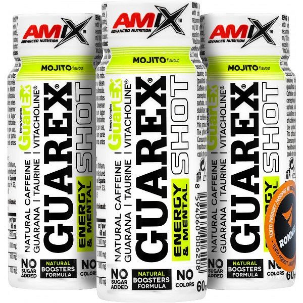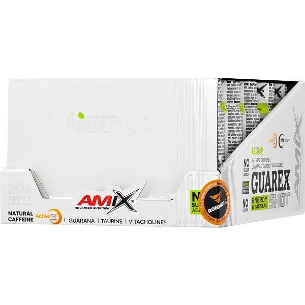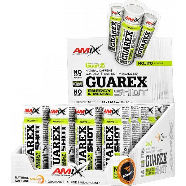 Guarex® Energy & Mental Shot je "kapesní" doplněk stravy v tekuté formě v balení skladných ampulí. Excelentní dávka energie založená na vysokém obsahu extraktu z guarany, VitaCholine® (cholin bitartrát), taurinu a suroviny ActiveTR™ - neboli přírodním enkapsulovaném kofeinu. Navíc si jej díky jednotlivým ampulím můžete snadno vzít takřka kamkoli!