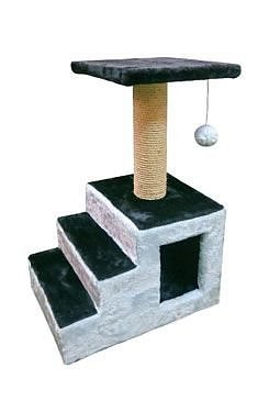 Komfortní škrabadlo Rocco se schody, boudičkou a odpočívadlem. O zahnání nudy se postará plyšová bambulka.