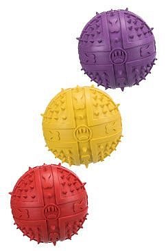 Míč pro psy z přírodní gumy. Hračka je vhodná pro psy všech plemen a věkových kategorií Zajistí vašemu pejskovi dlouhé hodiny zábavy. Gumový míč s měkkými bodlinami na povrchu a pískacím mechanismem uvnitř je použitelný jak na suchu tak i ve vodě.