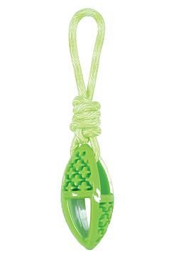 Oválná hračka pro psy z termoplastické gumy s lanem je vhodná pro aktivní psy.