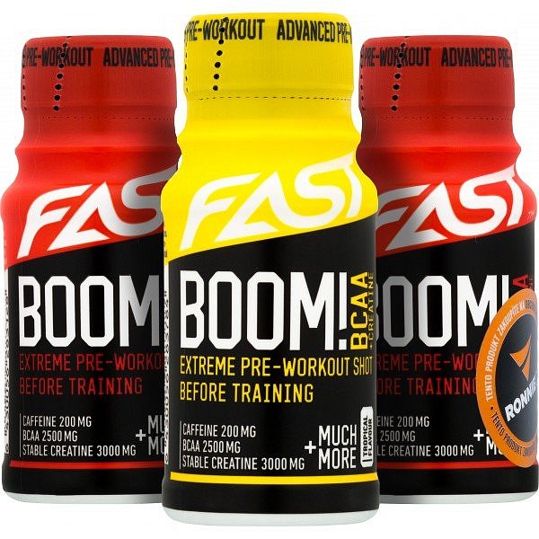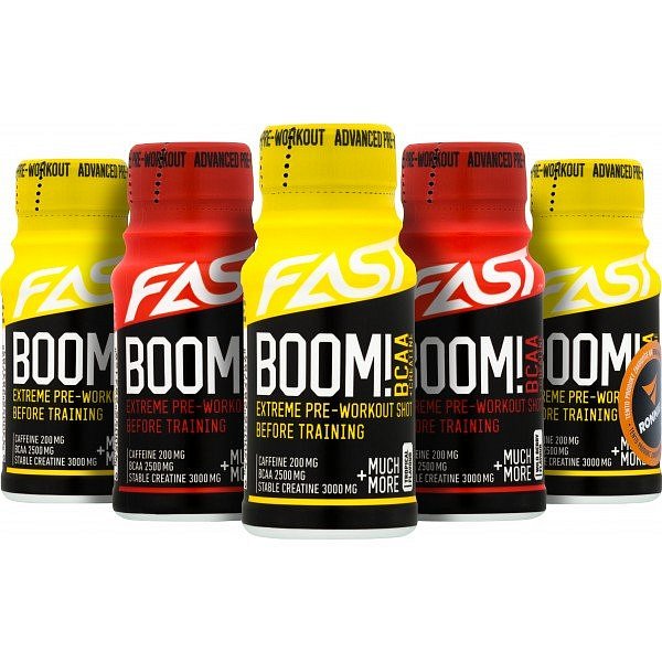 FAST Boom! je nejkomplexnější pre-workout na trhu, který kromě klasických složek, jako je např. arginin, beta-alanin či kofein, obsahuje navíc BCAA, kreatin či L-karnitin, což potvrzuje jeho jedinečnost. Svým vyváženým poměrem všech složek rychle dodá energii před tréninkem a zároveň díky BCAA redukuje odbourávání svalových tkání během cvičení. Extrémní předtréninkový produkt v praktických ampulích.