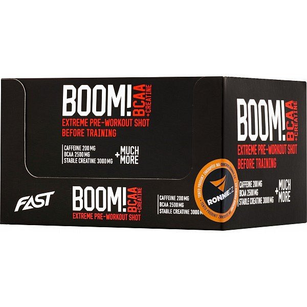 FAST Boom! je nejkomplexnější pre-workout na trhu, který kromě klasických složek, jako je např. arginin, beta-alanin či kofein, obsahuje navíc BCAA, kreatin či L-karnitin, což potvrzuje jeho jedinečnost. Svým vyváženým poměrem všech složek rychle dodá energii před tréninkem a zároveň díky BCAA redukuje odbourávání svalových tkání během cvičení. Extrémní předtréninkový produkt v praktických ampulích.