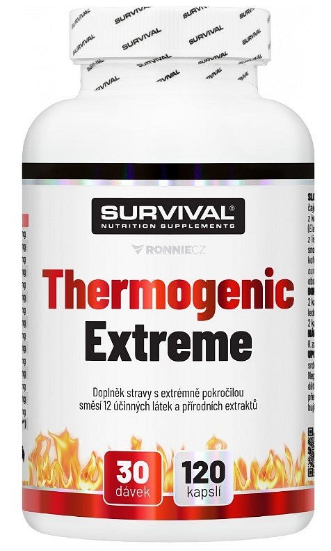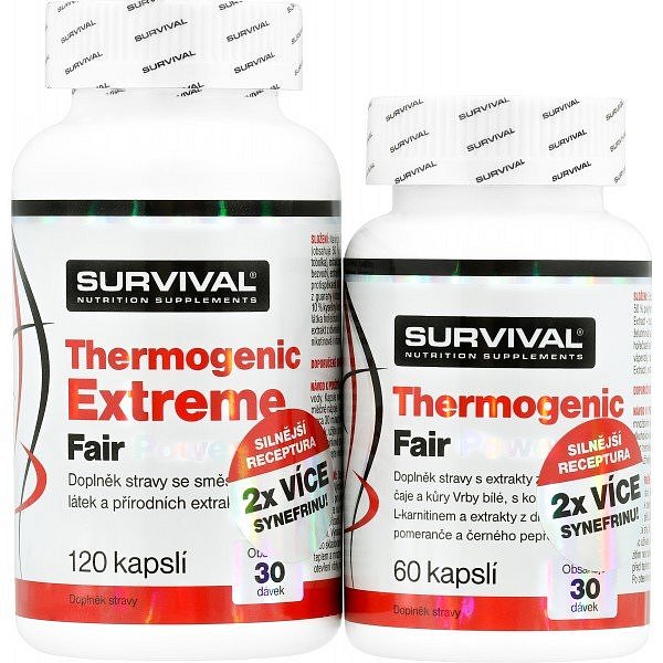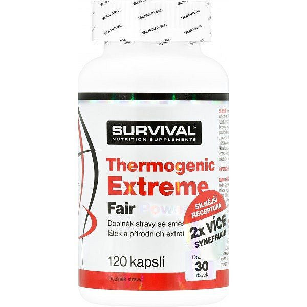 Thermogenic Extreme Fair Power je v současnosti nejsilnějším komplexním doplňkem sportovní výživy pro všechny sportovce usilující o podporu spalování podkožních tuků. Obsahuje unikátní kombinaci 12 účinných a vědeckými výzkumy ověřených látek (kompletní popis včetně odkazů na studie najdete níže). Tato novinka společnosti Survival je silnější a ještě účinnější verzí oblíbeného Thermogenic Fair Power, kterého se jen v České republice prodalo přes 30.000 kusů. Porovnáte-li složení Thermogenic Extreme Fair Power s jakýmkoliv (!) doplňkem stravy pro podporu spalování tuků, sami si ověříte, že nový „Extreme“ je tím nejsilnějším suplementem, jaký současný trh se sportovní výživou nabízí.