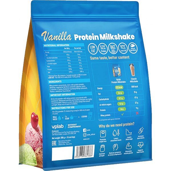 Mléčný shake s vysokým obsahem bílkovin, nízkým obsahem tuku, excelentní chutí a jemnou texturou z Velké Británie pro profesionální i rekreační sportovce či aktivní lidi, kteří chtějí zvýšit příjem kvalitních bílkovin. Chutná stejně skvěle jako běžný shake, ale má o mnoho lepší složení. Ideální pro každodenní konzumaci. Vzhledem k tomu, že bílkoviny jsou hlavním stavebním kamenem svalů, je vhodné používat VPLab Protein Milkshake po tréninku, aby Vašim svalům dodal bílkoviny a také je chránil před katabolickými procesy.