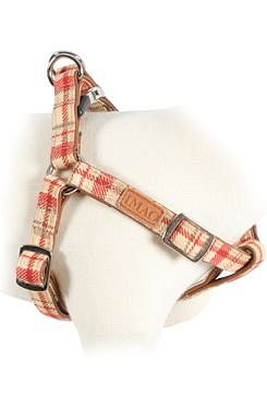 Nastavitelný postroj se skotským vzorem a s postříbřenými sponami. Všechna vodítka, obojky a postroje z této řady jsou opatřena koženou nášivkou "Imao".