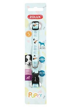 Nastavitelný textilní obojek pro štěňata v jemných pastelových barvách s nápisem PUPPY a obrázkem.
