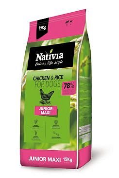 Receptura respektuje přirozené zákonitosti výživy psa. Obvyklá kombinace obilovin či brambor je zcela nahrazena pouze kvalitní rýží. Ta svojí stravitelností a profilem aminokyselin tyto tradiční suroviny převyšuje, nezatěžuje organismus a společně s ostatními komponentami výrobku zajistí zdravou výživu psa. Nativia Junior maxi v řadě Chicken&Rice obsahuje 78% bílkovin živočišného původu.