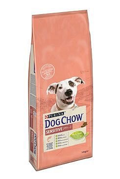 Kompletní, prémiové krmivo Purina Dog Chow pro dospělé průměrně aktivní psy s citlivou pokožkou nebo zažívacími problémy, s lososím masem a rýží.