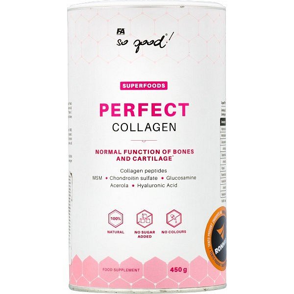 FA So Good! Perfect Collagen je přípravek, který Vám umožní obohatit každodenní stravu o složky důležité pro pohybový aparát. Složení výrobku je promyšlená kompozice hydrolyzovaného kolagenního proteinu, MSM, glukosaminu a chondroitinu, kyseliny hyaluronové a vitamínu C. Výrobek je doplněn přírodními přísadami - acerolou a šípkovým extraktem. Je určen lidem, kteří chtějí udržet optimální stav kostí a chrupavek a působit proti účinkům postupujícího procesu stárnutí organismu. Doporučen pro ženy i muže.