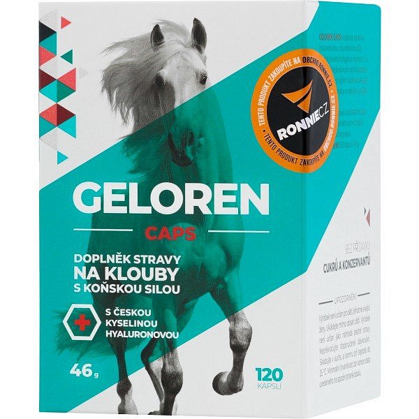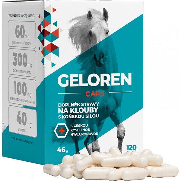 Kloubní výživu Geloren Caps vyvinuli čeští vědci speciálně pro lidi, kteří dbají na zdravý životní styl a není jim lhostejné, jaké potraviny konzumují. Kapsle neobsahují konzervanty ani plnidla a jsou bez cukru. Geloren Caps je doplněk stravy pro lidi založený na receptuře velmi oblíbené a účinné koňské kloubní výživy Geloren HA. Obsahuje vysoké množství kyseliny hyaluronové a 3 další aktivní látky na podporu pohybového aparátu (chondroitin sulfát, hydrolyzovaný kolagen a vitamín C). Snadné dávkování v podobě kapslí ve tvaru válcových tablet.