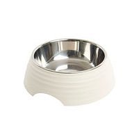 Tato miska se skládá z dvou částí. Vnitřní nerezová část lze vyjmout a lehce omýt.Vnější část je vyrobena z plastu melamin,který je zdravotně nezávadný. Na dně misky jsou gumové nožičky a miska proto neklouže po podlaze.