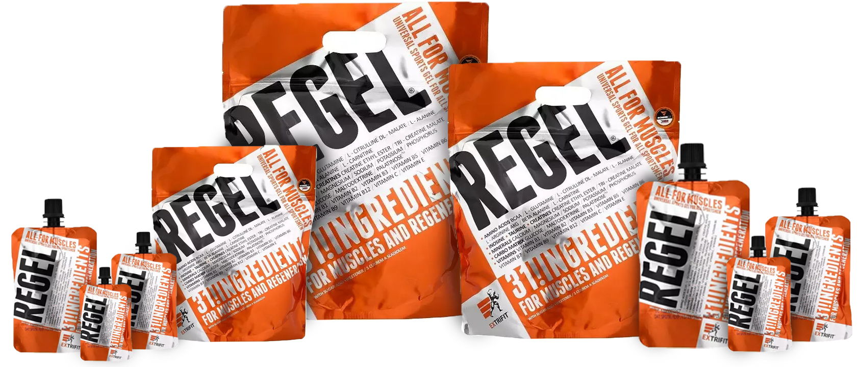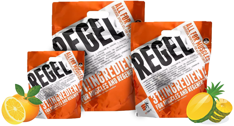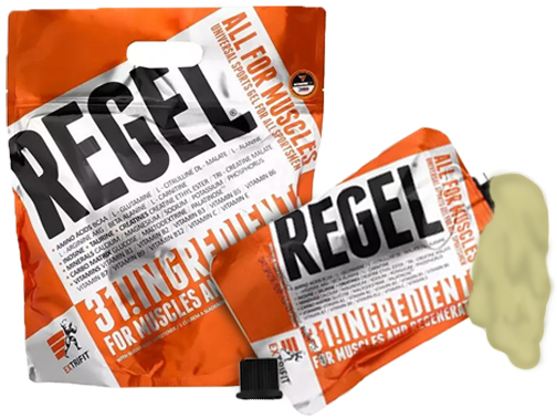Regel je jedinečný regenerační produkt na trhu pro použití při tréninku a zejména po tréninku. Je to unikátní regenerační a energetizující prostředek z kategorie all-in-one (vše v jednom), který Vám dodá všechny potřebné živiny pro rychlou regeneraci a obnovení energie po tvrdém tréninku. Obsahuje pečlivě vyvážený poměr tří druhů sacharidů a volných aminokyselin, anabolizéry, dvě formy kreatinu, komplex vitamínů a minerálních látek. A to vše ve formě hotového gelu připraveného k okamžité konzumaci! Sáček s uzávěrem jde navíc opětovně zavřít a rozdělit tak obsah do několika dávek a přizpůsobit potřebám Vašeho tréninku.