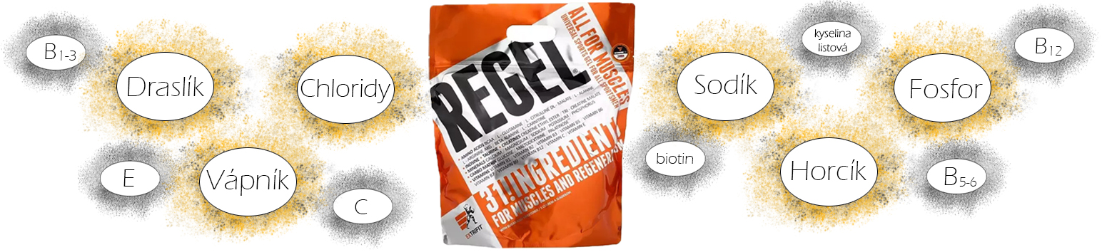 Regel obsahuje široký komplex látek nutných pro rychlou regeneraci po fyzické zátěži: tři vyvážené zdroje sacharidů (maltodextrin, dextrózu a isomaltulózu Palatinose), které zajistí Vašemu tělu dostatek energie a podpoří procesy zotavení po sportovním výkonu. Obsah volných aminokyselin zajistí regenerační a antikatabolický účinek (větvené aminokyseliny BCAA, alanin a nejvíce zastoupená aminokyselina ve svalové hmotě - glutamin). Energizéry jako inosin, taurin a karnitin odvrátí únavu po fyzické aktivitě. Dvě formy kreatinu – kreatin ethyl ester a tri kreatin malát – rychle obnoví a navýší zásoby kreatinfosfátu v zatížených svalech. Anabolizéry jako beta alanin, citrulin a arginin AKG, jež působí jako stimulanty produkce NO (oxidu dusnatého), Vám zvýší průtok krve do svalů a tím natlačí všechny potřebné látky pro regeneraci až do svalových buněk. Unikátní vitamínový matrix a komplex minerálních látek pak zabezpečí dostatek všech mikronutrientů nutných k regeneraci organismu po fyzické zátěži.