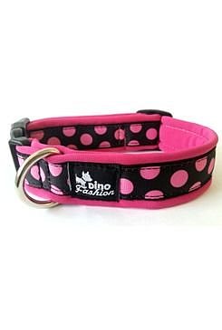 Stylový obojek Dinofashion. Základ tvoří pevný popruh pošitý růžovým softshellem s černou stuhou s růžovými puntíky. Velikost obojku je nastavitelná se zapínáním na plastový trojzubec. Vyrobeno v České republice.