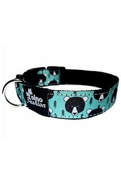 Popruhový obojek s motivem. Základ obojku tvoří pevný popruh v černé barvě, na kterém je našita stuha s potiskem medvídka. Obojek se zapíná na plastový trojzubec. Plastová posuvná spona umožňuje jednoduché a přesné nastavení délky. Na obojku je připevněno kovové oko, které slouží k připnutí vodítka.
