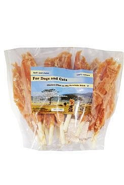 Křehké kuřecí filety sušené na bílé buvolí tyčce cca 18cm. Pro psy.
