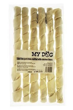 25cm dlouhá tyč z bílé vepřové kůže o průměru 2cm plněná kuřecími játry po celé délce. Pro psy.