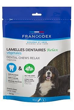 Dentální plátky RELAX pomáhají snižovat tvorbu zubního plaku a kamene a osvěžuje dech vašeho psa díky jejich abrazivnímu povrchu a tvaru do písmene „Z“. Žvýkací plátky obsahují zelený čaj - zdroj L-theaninu, o kterém je známo, že má uklidňující účinky. Bez přidaných barviv.