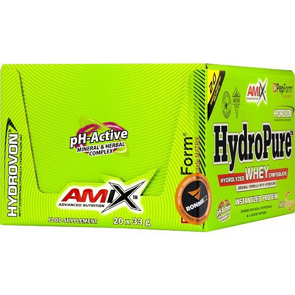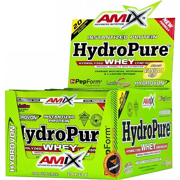 HydroPure Whey Protein je špičkový protein se 100% obsahem značkové suroviny Hydrovon. Ultra čistý hydrolyzovaný syrovátkový CFM izolát se rychle vstřebává a rychle zásobí svaly bílkovinami. Obohaceno o unikátní peptidy PepForm Triple-Matrix, pH-aktivní minerální a bylinný komplex a probiotika LactoSpore (Lactobacillus sporogenes). Bílkoviny přispívají k nárůstu a udržení svalové hmoty. Chutná lahodně ve spojení s vodou, džusem, mlékem, ovesnou kaší apod.