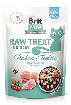 Doplňkové krmivo pro dospělé kastrované kočky, mrazem sušené pamlsky a toppery s neodolatelnou chutí a s výhodami syrového masa pro podporu výživy - kuře a krůta s probiotiky a brusinkami.