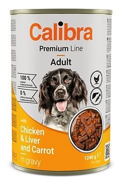 Kompletní krmivo pro dospělé psy. Mono nepravidelné kousky konzervy pro psy s kuřecím, játry a mrkví v omáčce.