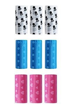 Pytlíky na psí exkrementy s potiskem tlapek, teček a srdíček se vejdou téměř do všech pouzder určených pro sáčky na exkrementy.