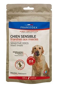 FRANCODEX HMYZÍ POCHOUTKA neobsahuje lepek a je vhodná zvláště pro citlivé psy. Podílejí se také na remineralizaci kostry, a to díky vitamínu D3 obsaženému v hmyzí moučce. Výhody hmyzí moučky použité v tomto produktu na remineralizaci kostí byly klinicky testovány.