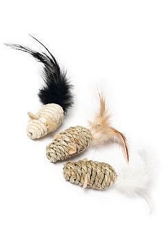 Hračka pro koťata i dospělé kočky, tři malé myšky s peřím vyrobené z pleteného lana.