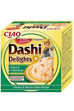 Dashi je tradiční japonský rybí vývar z tuňákových vloček, který je známý svou vyjímečnou, lahodnou chutí. Zařazení Dashi do jídelníčku vaší kočky může dodat krmení nový rozměr a učinit ho vyjímečným zážitkem. Nejde jen o chuť - dashi může poskytnout i důležité živiny včetně vitaminů a minerálů. Dashi má nízký obsah kalorií a tuku, takže je zdravým doplňkem stravy vaší kočky. Je to produkt na bázi vývaru, což znamená, že obsahuje vysoké množství vody a tím pomáhá udržet zdraví vaší kočky. Dashi se může stát chutným a výživným doplňkem stravy vaší kočky, který si díky její neodolatelné chuti určitě zamiluje. Všechny produkty Inaba jsou vždy bez obilovin, zbytečných ingrediencí a pochybných přísad a jsou vyrobené z pravého mořského tuňáka a kuřat chovaných na farmách.