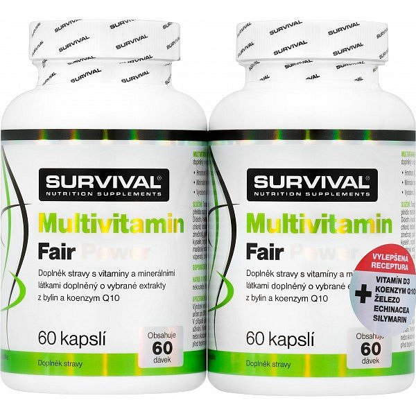 V případě, že pravidelně užíváte multivitamínový přípravek, měli byste vědět, že nárazově podané velké množství vitamínů a minerálních látek nedokáže lidský organismus vstřebat a přebytek prostě a jednoduše vyloučí – tzn. užíváte-li doplňky s obsahem megadávek těchto látek, Vaše tělo s velkou pravděpodobností velkou část Vaší (mnohdy finančně nezanedbatelné) investice do zdraví vůbec nevyužije. Proto Survival vytvořil Multivitamin Fair Power – dokonale vyvážený suplement, který v každé kapsli obsahuje přesně 100 % doporučené denní dávky důležitých vitamínů a vybraných minerálních látek významných (nejen) pro sportovce. Každá kapsle Multivitamin Fair Power tak umožní dodat Vašemu tělu jednak to, co skutečně potřebuje, a zároveň v dávkách, jaké má šanci reálně využít. Pocítíte-li přesto (např. kvůli náročné práci, nachlazení a podobně) potřebu dávkování zvýšit, i v případě použití více kapslí v různých denních dobách dáte tělu (právě s ohledem na použití v jiný čas) dostatek prostoru přijaté látky využít. Celé využitelnosti také přispívají obsažené minerální látky ve vysoce využitelných chelátových formách!