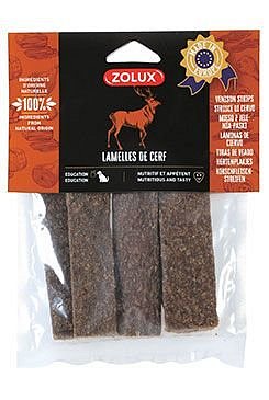 Pamlsek pro psy ve formě jeleních proužků je ideálním doplňkem denní porce krmiva. Svačiny připravené ze 100% ingrediencí přírodního původu jsou mimořádně chutné a snadno stravitelné. Jsou také cenným zdrojem bílkovin a lze je využít například jako odměnu při tréninku. Díky vhodné tepelné úpravě výrobek nevyžaduje použití konzervačních látek.