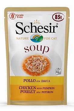 Kapsička pro kočky Schesir Cat Soup je plná chutných filet masa v kombinaci se zeleninou ve formě polévky. Kočky milují vlhké krmivo a zejména tekoutou část. Kapsičku Schesir Cat Adult Soup lze podávat samostatně nebo je ideální ve směsi s granulemi pro dodání extra chuti.