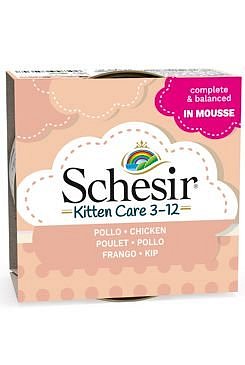Konzerva pro kočky Schesir Kitten Care obsahuje kompletní bezobilné vyvážené krmivo s filetami z masa v nadýchané pěně s přídavkem vaječných bílkovin a taurinu důležitého pro vývoj mozku. Je plná skutečného masa a vitamínů, minerálů a bílkovin, které vaše malé koťátko potřebuje pro svůj správný vývoj a podporu imunity.