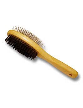 Dřevěný oboustranný kartáč. Drátěnými štětinami odstarníte odumřelou srst a nylonovým kartáčem vyčešete prach a tak zajistíte lesk pro srst Vašeho psa.