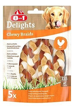 Pamlsky pro psy 8in1 Delights Chewy Braids jsou vyrobené z lahodné hovězí kůže, díky které jsou mimořádně pevné a z kuřecího masa, díky kterému jsou mimořádně chutné. Vše je propleteno tak, aby vznikl hravý pamlsek, který psi milují. Toto balení Delights Braids obsahuje pět pamlsků, které dlouho vydrží a jsou tak ideální pro zabavení vašeho malého psa. Jsou také skvělé pro zuby a dásně, protože přirozený abrazivní účinek žvýkání pomáhá regulovat tvorbu zubního kamene a plaku na psích zubech. 8in1 Delights Chewy Braids neobsahují žádná umělá barviva, příchutě ani konzervační látky a žádný přidaný cukr ani GMO. Navíc tyto chutné pamlsky pečené v troubě mají vysoký obsah bílkovin a nízký obsah tuku, takže svému psovi dopřejete skvělou svačinku.