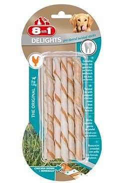 Žvýkací tyčinky 8in1 Delights Twist jsou kroucené a díky své velikosti vyhovují malým a středním psům. Pamlsky pro psy Delights Twist kombinují surovou kůži s chutným masem uvnitř. Jejich funkcí je odstranění zubního plaku a zamezení tvorby zubního kamene. Tyčinky s kuřecím masem a s nízkým obsahem tuku poskytují dlouhotrvající potěšení ze žvýkání.