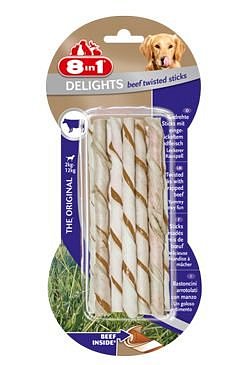 Žvýkací tyčinky 8in1 Delights Twist jsou kroucené a díky své velikosti vyhovují malým a středním psům. Pamlsky pro psy Delights Twist kombinují surovou kůži s chutným masem uvnitř. Jejich funkcí je odstranění zubního plaku a zamezení tvorby zubního kamene. Tyčinky s hovězím masem a s nízkým obsahem tuku poskytují dlouhotrvající potěšení ze žvýkání.
