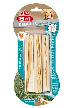 Žvýkací tyčinky 8in1 Delights Dental jsou vyrobené z kuřecího masa, které je obohaceno o speciální formuli proti zubnímu plaku. Chutný prémiový pamlsek si zamiluje každý čtyřnohý kamarád. Pamlsky pro psy Delights obsahují pouze 2 % tuku, neobsahují umělá barviva a dochucovadla. Pravidelné žvýkání eliminuje tvorbu zubního plaku a kamene.