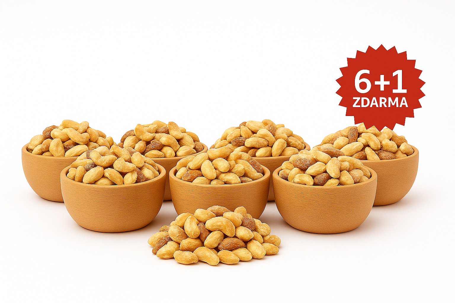 Pražené arašídy a kešu poskytují rychlou energii díky obsahu zdravých tuků a bílkovin – ideální volba pro každodenní výkon i rychlou svačinu. A teď navíc v akci 6+1 zdarma!