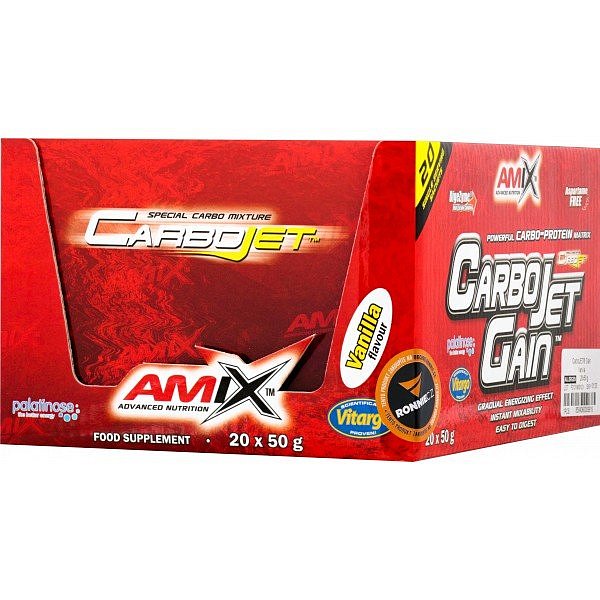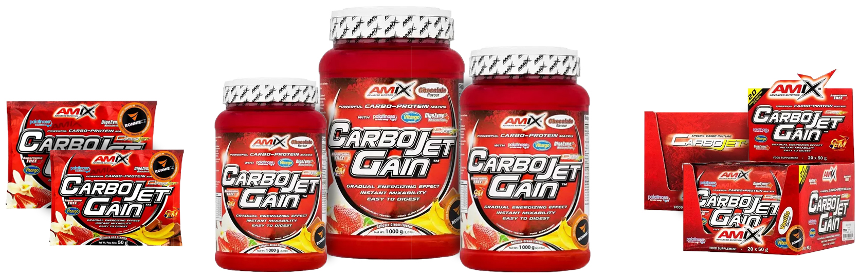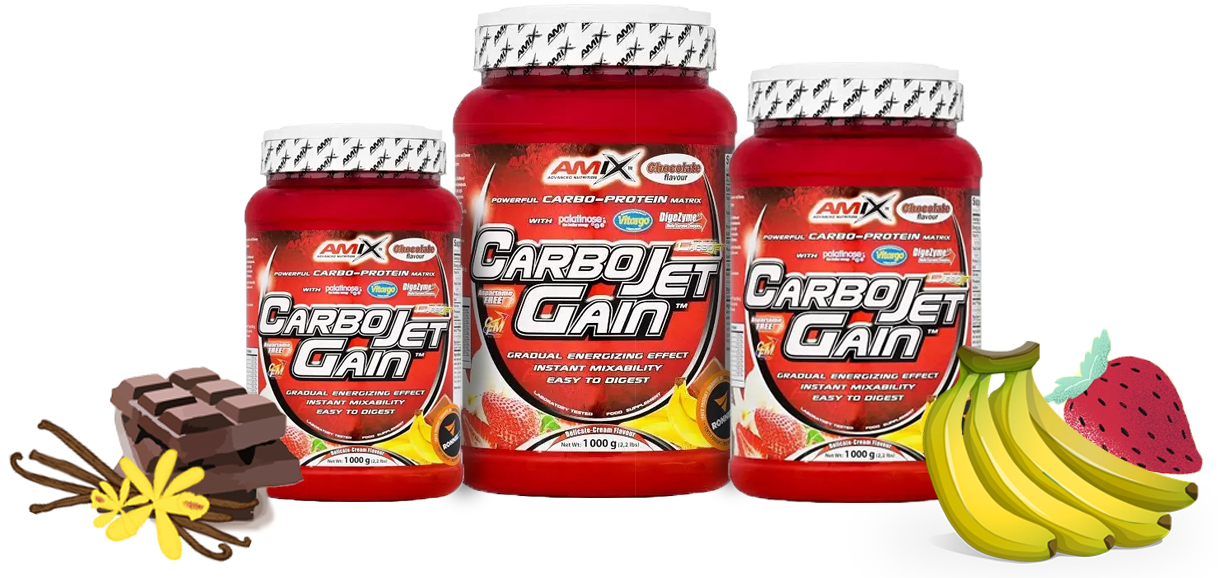 CarboJet™ Gain je speciální sacharidoproteinový práškový koncentrát. Obsahuje vysoce kvalitní bílkoviny Amix™ Protein Blend a exkluzivní komplex sacharidů Amix™ CarboJet™ Matrix zahrnujících vysokomolekulární škrob Vitargo® a postupně vstřebatelnou isomaltulózu Palatinose®. Neobsahuje aspartam. Obsažené bílkoviny přispívají k růstu a udržení svalové hmoty.