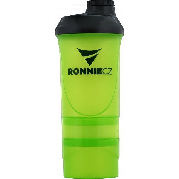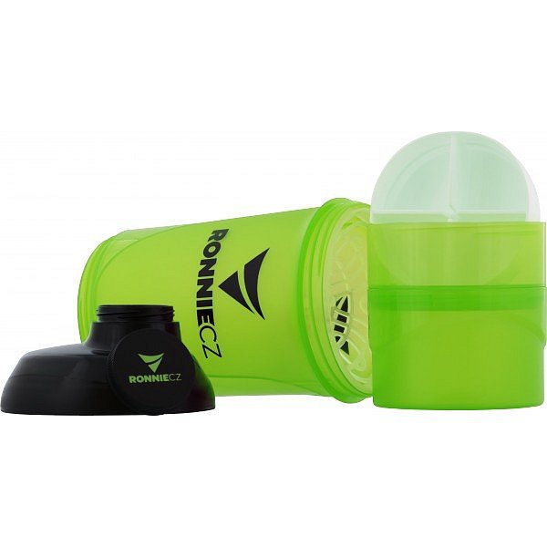 Praktický matný a transparentní šejkr Ronnie.cz se zásobníky na tablety či sypké formy suplementů! Šejkr je dostupný v šesti barevných kombinacích, a to růžovo-černé, zeleno-černé, modro-černé, fialovo-černé, červeno-bílé a černé. Po stranách samotného šejkru jsou v průhledech rysky v ml/oz pro odměření objemu tekutiny (do 500 ml), šejkr samozřejmě obsahuje mřížku pro lepší rozmíchání nápoje. Po stranách šejkru a na malém víčku je umístěno logo Ronnie.cz. První z odnímatelných zásobníků obsahuje vloženou přihrádku se čtyřmi odděleními na tablety či kapsle, přihrádku lze ale i vyjmout, objem takto získaného prostoru (např. pro odsypání proteinu nebo gaineru) je 150 ml. Druhý (spodní) zásobník má objem dalších 200 ml.