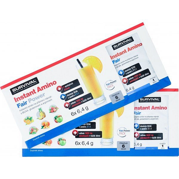 Instant Amino Fair Power jsou fermentací vyrobené volné BCAA aminokyseliny L-leucin, L-isoleucin a L-valin v poměru zastoupení 2 : 1 : 1, doplněné o další 2 díly čistého L-glutaminu a 1 díl L-argininu alfaketoglutarátu - to vše v moderní, snadno rozpustné instantní formě. Každá dávka (6,4 g) obsahuje plných 5000 mg aminokyselin (4800 mg u příchutě cuba libre), prakticky žádné tuky ani cukry. Aminokyseliny Instant Amino Fair Power se velmi snadno rozpouštějí a výborně chutnají. Jsou vhodné pro použití jak v průběhu dne, tak i před nebo po tréninku, ale i v průběhu cvičení. Obsažené aminokyseliny se prakticky okamžitě vstřebávají do krve a i díky obsahu L-argininu se s maximální účinností transportují do svalů. Instant Amino Fair Power využívají stejně jako ostatní produkty značky Survival jen špičkových surovin, neobsahují umělá barviva a mají přehledné, nic neskrývající složení (ověřené laboratorními rozbory - viz galerie fotografií produktu).