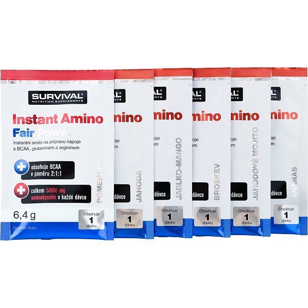 Instant Amino Fair Power jsou fermentací vyrobené volné BCAA aminokyseliny L-leucin, L-isoleucin a L-valin v poměru zastoupení 2 : 1 : 1, doplněné o další 2 díly čistého L-glutaminu a 1 díl L-argininu alfaketoglutarátu - to vše v moderní, snadno rozpustné instantní formě. Každá dávka (6,4 g) obsahuje plných 5000 mg aminokyselin (4800 mg u příchutě cuba libre), prakticky žádné tuky ani cukry. Aminokyseliny Instant Amino Fair Power se velmi snadno rozpouštějí a výborně chutnají. Jsou vhodné pro použití jak v průběhu dne, tak i před nebo po tréninku, ale i v průběhu cvičení. Obsažené aminokyseliny se prakticky okamžitě vstřebávají do krve a i díky obsahu L-argininu se s maximální účinností transportují do svalů. Instant Amino Fair Power využívají stejně jako ostatní produkty značky Survival jen špičkových surovin, neobsahují umělá barviva a mají přehledné, nic neskrývající složení (ověřené laboratorními rozbory - viz galerie fotografií produktu).