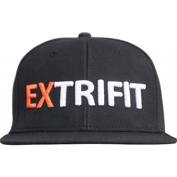 Černá unisex kšiltovka s výšivkou oranžovo-bílého loga Extrifit na přední straně. S rovným kšiltem. Univerzální velikost. Lze zvětšit či zmenšit, na zadní straně čepice je možnost regulace obvodu.