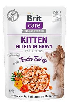 Filetky ve šťávě s jemným krůtím. Obohaceno o rakytník a lichořeřišnici. Kompletní superprémiové bezobilné krmivo pro koťata.