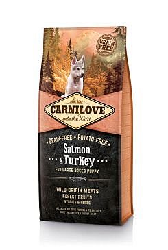 Granule Carnilove Salmon & Turkey je vysoce kvalitní krmivo z lososa a krocana bez obilovin a bez brambor vhodné pro štěňata velkých plemen vážících ≥ 25 kg, a 30 měsíců.