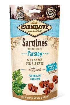 Poloměkké a křupavé pamlsky pro kočky Carnilove Snack s masem ze sardinek. Lahodné pamlsky Sardines with Parsley (sardinky s petrželí) jsou vhodné pro všechny kočky. Ve složení nejsou obsaženy žádné obiloviny a ani umělá barviva. Petržel podporuje zdravé trávení.