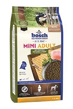 Bosch Dog Adult Mini Drůbeží & Proso je plnohodnotné, vyvážené a kompletní krmivo pro dospělé psy malých a trpasličích plemen, kteří jsou často velmi vybíraví. Vynikající chuť, výživné a lehce stravitelné ve formě malých kroket. Chelátová forma zinku spolu s optimálním poměrem mastných kyselin pro zdravou kůži i srst, vyvážený obsah různých, odlišně rozpustných přírodních vláknin stimuluje a stabilizuje zažívání, lecitn a L-karnitin pro podporu energetické látkové výměny.Kompletní krmivo pro dospělé psy malých plemen, v normální aktivitě a běžné zátěži jakou je například procházka nebo pobíhání po zahradě. Vynikající chuť, výživné a lehce stravitelné ve formě malých kroket. Neobsahuje lepek.