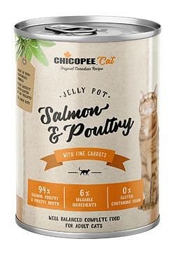 Ryba a rybí deriváty 35 % (z toho 35 % lososa směs masa, jatečně upravená těla), maso a deriváty živočišného původu 34 % (z toho 34% drůbeže směs masa, játra, srdce, krky), kuřecího vývaru (25 %), mrkve (4 %), rýžová mouka (1 %), minerály (1 %).
